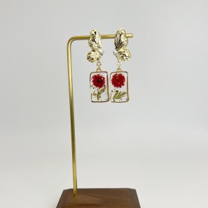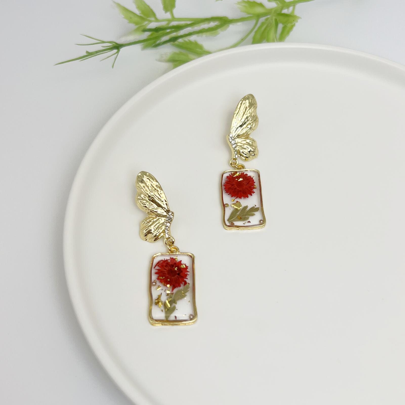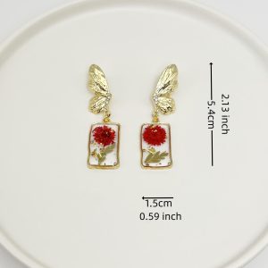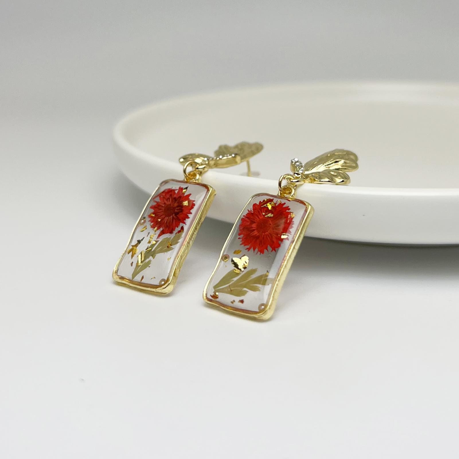 Each pair of earrings is carefully handcrafted to ensure that every detail is perfect. The small red flowers are carefully selected and then preserved in resin to retain their natural vibrancy. The shape of the butterfly adds a touch of elegance and femininity to the design, allowing these earrings to brighten up any outfit and suit any occasion. These earrings are perfect for those who love nature and want to add a touch of whimsy and beauty to their look.