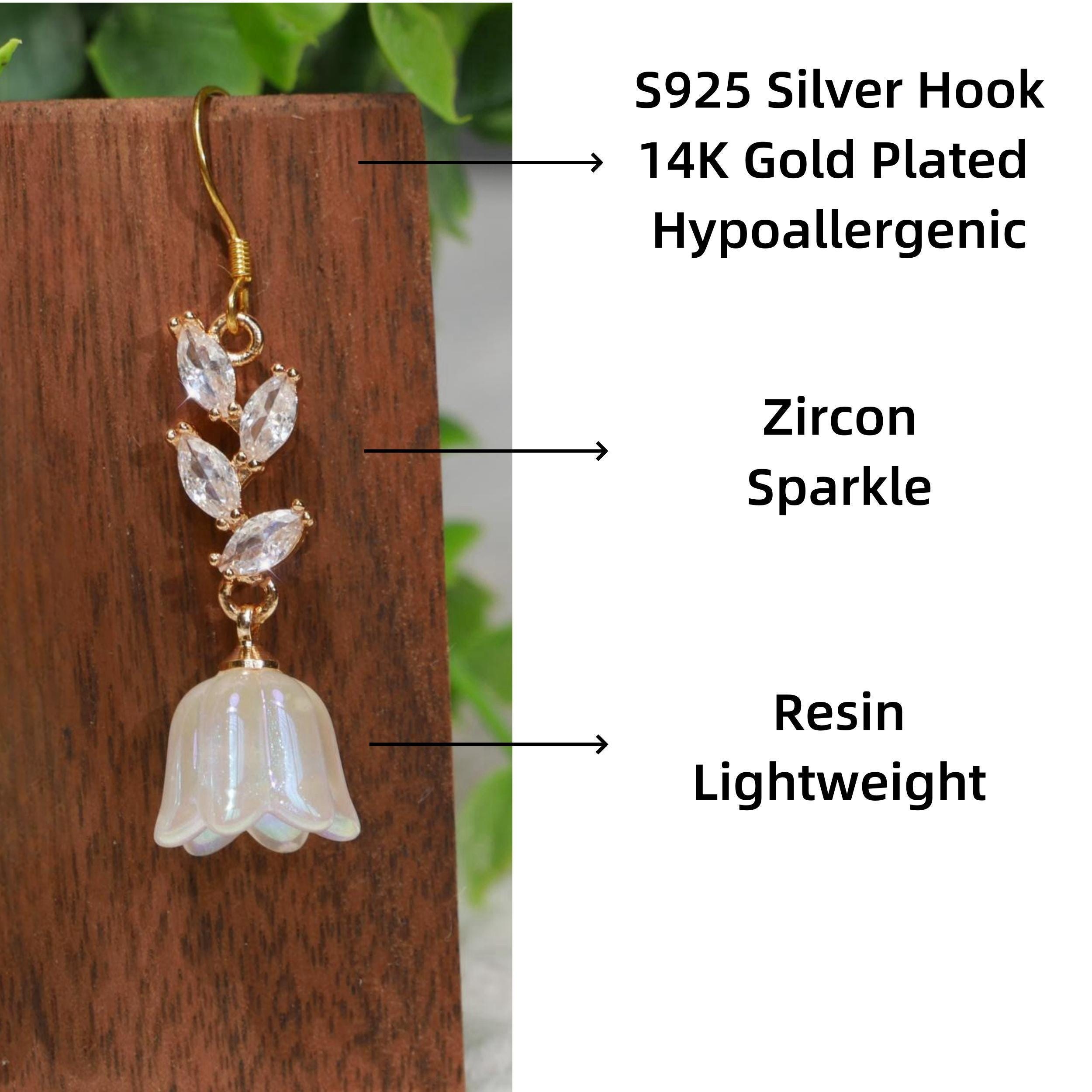 🙂Introducing these stunning handmade earrings, a pair of earrings made with S925 Gold Plated Silver hooks, which is hypoallergenic, Zircon leaves and resin Lily of the valley. The crystalline flowers are white and transparent. The overall design is natural and unique, lovely and vibrant. The earrings are striking for the unique you.